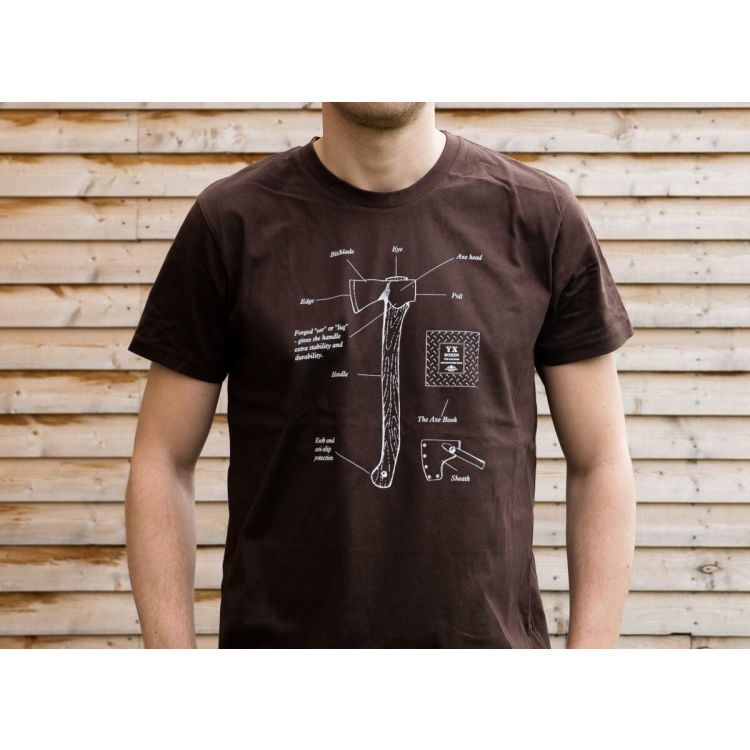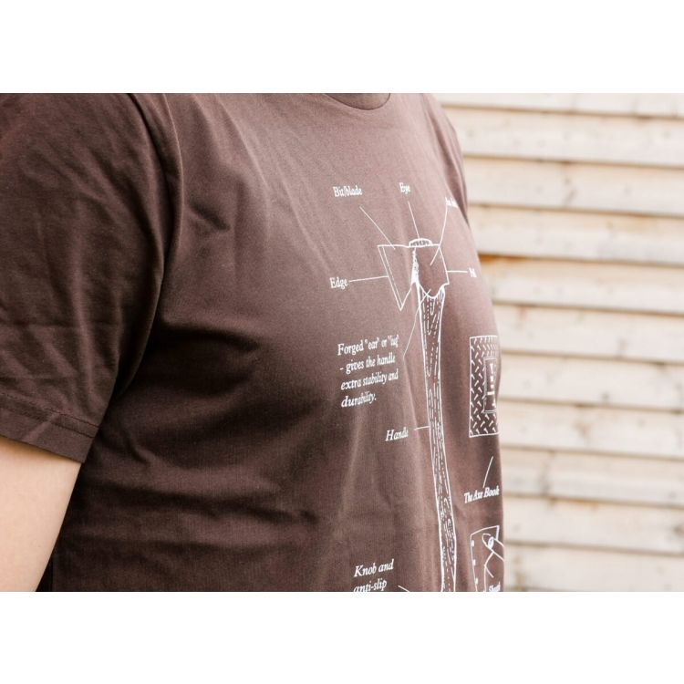A brown unisex T-shirt with a printed design of the different parts of an axe, placed on the chest. Logo placed on the neck.