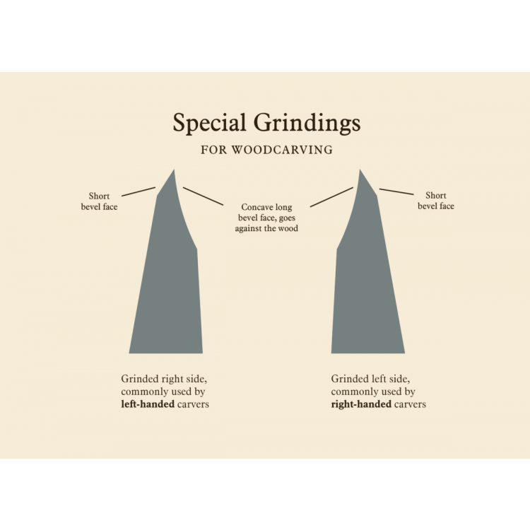The axe has a relatively long, curved cutting edge and comes standard with a double-sided grind. It can also be ordered with an asymmetric carving grind for right-handed or left-handed use, where the edge is ground on one side to allow for finer control and closer work.