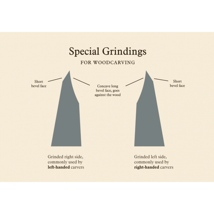 - Right-handed users often choose the Left Side Ground version, as the longer, slightly concave bevel face then comes closest to the wood, offering excellent support during carving. This has a short bevel on the right side, longer concave bevel on the left, which comes in contact with the wood piece.